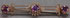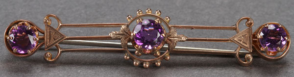 A VICTORIAN LADIES GOLD AND AMETHYST BAR PIN, CIRCA 1900. Containing three round facet cut prong set amethysts approximately 4.5 mm in a three bar pin with radiating beads, scrolled terminals and applied leaf carvings. Unmarked, length 2 inches (50 mm).