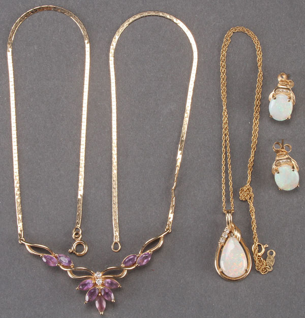 A LADIES 14K GOLD, GEMSTONE AND OPAL JEWELRY GROUP, LATE 20TH CENTURY. Comprising a 14k stylized leaf form pendant necklace with marquise cut amethyst and diamonds, and a pear shape opal and diamond pendant necklace with associated opal and diamond earrings. Total weight 14 grams.