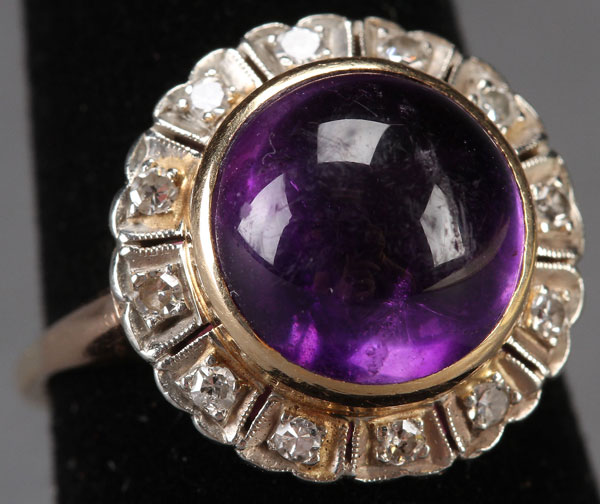 A LADIES GOLD CABOCHON AMETHYST AND DIAMOND RING, 20TH CENTURY. Containing a round cabochon cut amethyst approximately 11 mm diameter. Surrounded by 12 round cut diamonds. Unmarked. Size 6 ¾.
