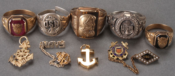 AN NINE PIECE MENS MILITARY AND CLASS RING JEWELRY GROUP, 20TH CENTURY. Comprising two sterling “USN” rings, a sterling “USN” lapel pin, a 10k tiger eye and gold cameo ring, a 10k Forest City HS ring (1936), a 10k Forest City HS ring (1943), a gold filled US Coast Guard lapel pin, a gold filled anchor pendant, and a 14k yellow gold anchor pendant. Gold weight approximately .29 troy ounces 10k and .05 troy ounces 14k.