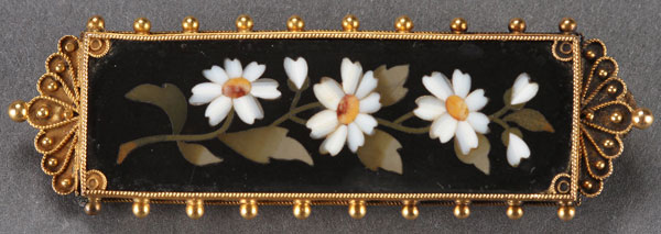 A LADIES VICTORIAN 18K GOLD PIETRA DURA FLORAL PIN. Comprising a rectangular panel inlaid with white floral blossoms and leaves on a black ground, set in a beaded and coiled gold wire frame. Length 2.25 inches (56 mm).