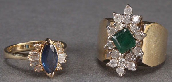 TWO LADIES GOLD, DIAMOND AND GEMSTONE RINGS, LATE 20TH CENTURY. Comprising a 14k blue sapphire and diamond ring (size 5.25), and a 10k emerald and diamond ring (size 7.5). Total weight 15 grams.