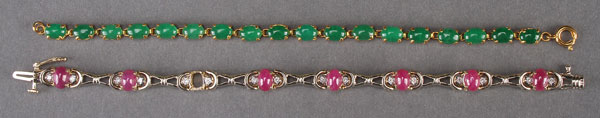 A LADIES 14K GOLD, RUBY AND DIAMOND BRACELET, LATE 20TH CENTURY. Set with seven oval cabochon rubies (one absent) and 16 small round diamonds with a total weight of approximately .54 carats, length 7 inches, total weight 14 grams. Together with a gold tone bracelet set with cabochon cut green jade stones.