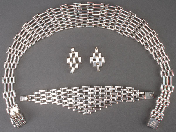 A FOUR PIECE MEXICAN SILVER JEWELRY GROUP, LATE 20TH CENTURY. Comprising an expanding multiple link necklace, bracelet, and earrings. Stamped .925, TL-51, Mexico. Length of necklace 19 inches. Total weight 9.4 troy ounces.