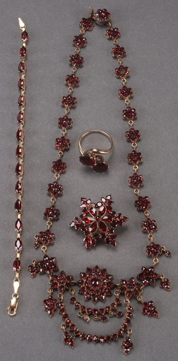 A VERY FINE LADIES GARNET JEWELRY GROUP. Comprising a 10k gold tennis bracelet, length 7 inches (17.5 cm); a Victorian necklace with rosette form beads and pendants, length 15.5 inches (39.5 cm); an unmarked gold ring; and a star shaped pin.