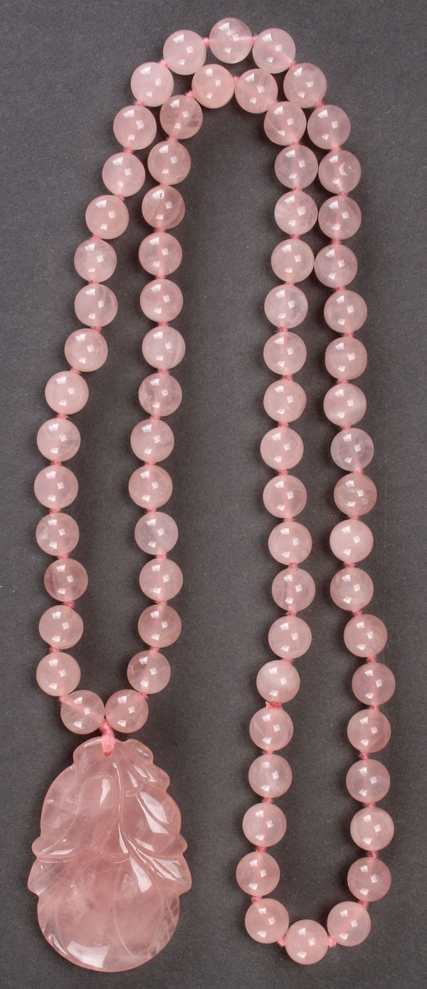 A FINE CHINESE CARVED PINK ROSE QUARTZ PENDANT NECKLACE, 20TH CENTURY. Comprising a strand of seventy-two 10mm beads in natural translucent pink rose quartz suspending a “Peach & leaf" form pink rose quartz pendant. Length 17.5 inches (44.5cm).