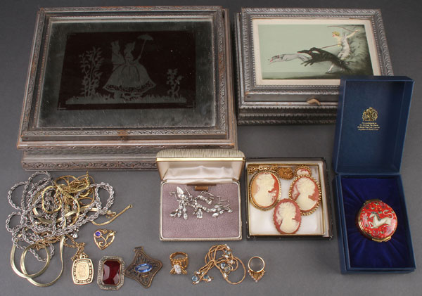 TWO ART DECO JEWELRY BOXES AND VINTAGE JEWELRY GROUP, 20TH CENTURY. Comprising a “Levries de Course” after Louis Icart box, a reverse painted silhouette scene box (7.5 inches x 10 inches), and 27 pieces of costume jewelry including faux cameo ensembles, rhinestones, gold filled chains, and other items.