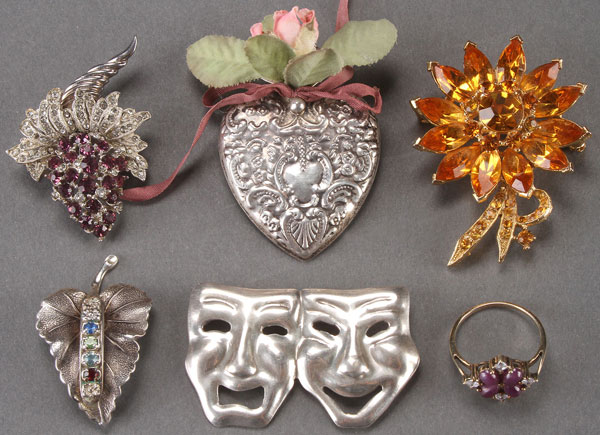 A SIX PIECE GROUP OF DECORATIVE JEWELRY, MID 20TH CENTURY. Comprising a cornucopia form brooch with rhinestone and amethyst colored cluster; a sterling silver repousséd heart form lapel vase; a Weiss amber colored stone floral pin; a sterling floriform pin with colored stones, stamped NRL; a Mexican silver theatrical mask pin; and a silver gilt birthstone ring. Largest length 2.5 inches (6.5 cm).