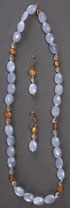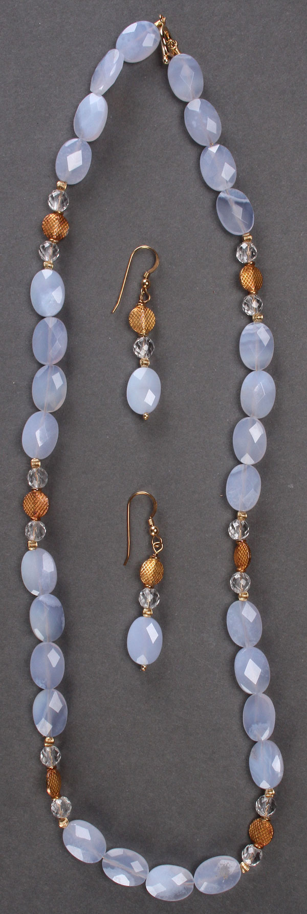 A LADIES CHALCEDONY AND ROCK CRYSTAL NECKLACE AND EARRING SET, NAMIBIA, LATE 20TH CENTURY. Comprising 28 oval faceted pale blue opalescent chalcedony beads with interspersed vermeil beads faceted rock crystal beads, with a pair of matching pendant earrings. Total length 22 inches (56 cm).