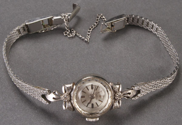 A LADIES 14K WHITE GOLD AND DIAMOND "ZODIAC" SWISS WRIST WATCH, 20TH CENTURY. With a later white gold filled bracelet.