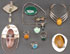 A STERLING CONTEMPORARY ARTIST JEWELRY GROUP, INCLUDING KIM CROCKER, LATE 20TH CENTURY. Eight pieces, comprising a large Kim Crocker brooch with malachite jade and other gemstones, a mid size Kim Crocker brooch with peridot and dolomite, a sterling artist made pendant with fire agate and kona dolomite titled "Michigan Landscape, Day", and other pieces including rings, bracelet and brooch decorated with malachite, amber and tiger-eye. Total weight 6.8 ounces.