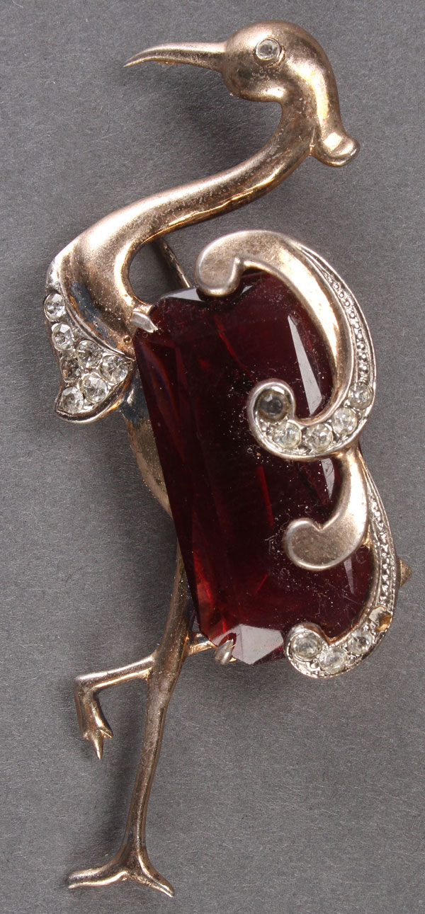 A FINE SILVER GILT AND STONE MOUNTED ART DECO STORK FORM BROOCH, MID 20TH CENTURY. Marked sterling. Length 3 inches.