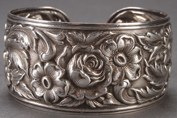 A KIRK & SON STERLING SILVER CUFF BRACELET, EARLY 20TH CENTURY. Finely repousséd with a rose and wildflower pattern the rounded terminal ends monogramed “V and “M”. Stamped “S. Kirk and Son, Sterling and 19F”. Width 2.625 x 1.25 inches. Weight 43 grams.