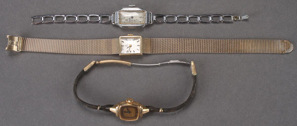 A GROUP OF THREE LADIES VINTAGE WATCHES, MID-LATE 20TH CENTURY. Comprising an Omega 14k gold filled, a Hamilton 10k gold filled, and a Waltham art deco in original box.