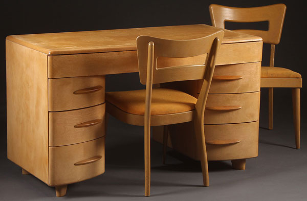 A HAYWOOD WAKEFIELD KNEEHOLE DESK, MID 20TH CENTURY. In wheat finish, model M315W with finished back, length 50 inches. Together with two M1554A side chairs.