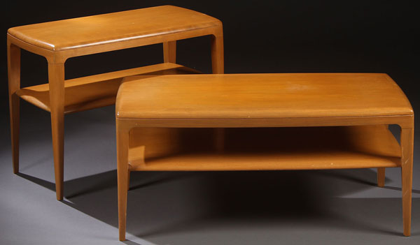 TWO HAYWOOD WAKEFIELD OCCASIONAL TABLES, MID 20TH CENTURY. In wheat finish, comprising a M317G end table and a M316G coffee table. Largest length 36 inches.