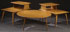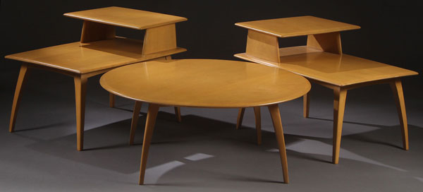THREE HAYWOOD WAKEFIELD OCCASIONAL TABLES, MID 20TH CENTURY. In wheat finish, comprising a M1508G round cocktail table (diameter 36 inches) and two M1504G step end tables.