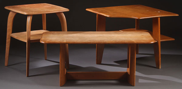 THREE HAYWOOD WAKEFIELD OCCASIONAL TABLES, MID 20TH CENTURY. Comprising a M337G lamp table, a C3755 corner table, and a C3756G oblong coffee table. Largest length 42 inches.