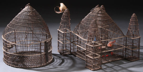 A PAIR OF WOVEN BENT WIRE BIRDCAGES, IN THE ANTIQUE STYLE. Largest height 15.75 inches (40 cm).