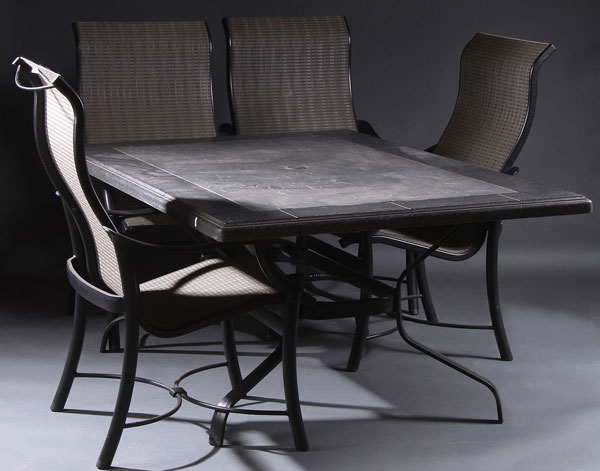 A CONTEMPORARY TROPITONE FIVE PIECE ALUMINUM PATIO SET. With faux slate composite top, black powder coat finish, and woven fabric seats. Table height 26.75 inches (68 cm), length 68.5 inches (174 cm), width 42.5 inches (108 cm). Chair height 41.75 inches (106 cm).