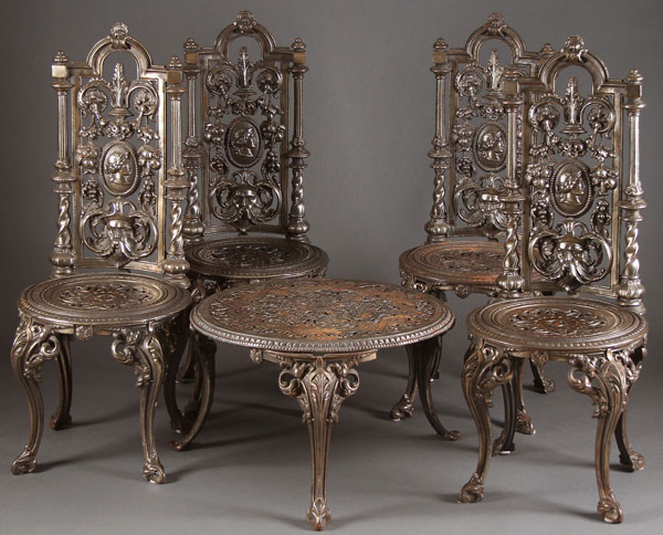 VICTORIAN STYLE CAST IRON GARDEN TABLE AND CHAIRS, 20TH CENTURY. Circular table and matching chairs with tall narrow backs each containing a central female portrait. Table diameter 24 inches, height 16 inches. Chair height 39 inches, width 15 inches, depth 17 inches.