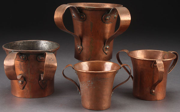 FOUR COPPER PASS MUGS OR BEER CUPS, 18TH/19TH CENTURY. Comprising three with two looped handles, and one with three looped handles. Largest height 5.25 inches (13.25 cm).