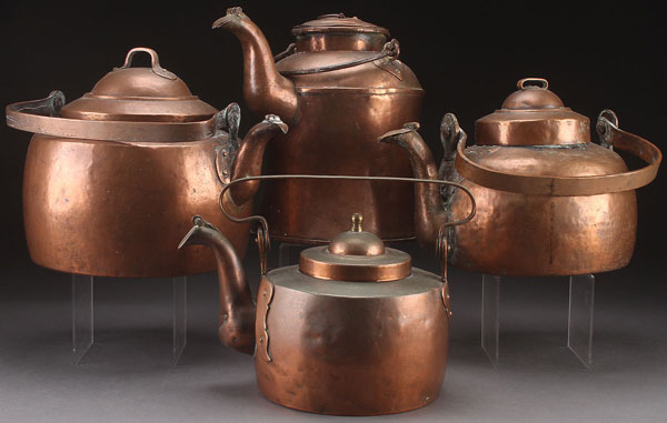 A GROUP OF FOUR LARGE COPPER KETTLES, 19TH CENTURY. Three with copper swing handles and one with wrought iron bail handle. Largest height 13.5 inches (34.25 cm).