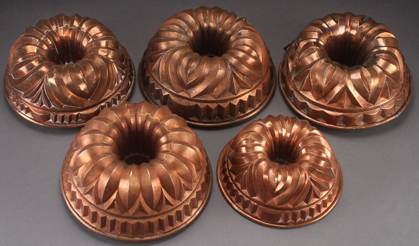 A GROUP OF FIVE ENGLISH COPPER RING MOLDS, 19TH CENTURY. Comprising four of graduated size with matching arched pattern, and another with similar design. Largest diameter 11 inches (28 cm).