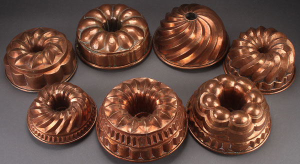 A GROUP OF SEVEN ENGLISH COPPER RING AND TUBE FOOD MOLDS, 19TH CENTURY. Of various size and patterns. All apparently unmarked. Largest diameter 10.75 inches (27.5 cm).