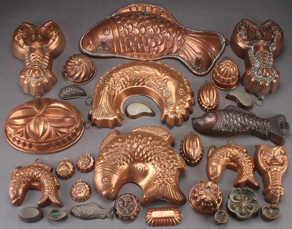 A GROUP OF MOSTLY ENGLISH COPPER FIGURAL FOOD MOLDS, 19TH/20TH CENTURY. Over 25 pieces of various forms including fish, lobster, melon, and swirls. With some cast bronze candy molds. Largest length 17 inches (43 cm).