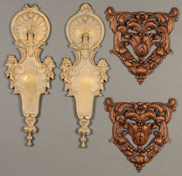 A GROUP OF BRONZE AND WOODEN PLAQUES, 20TH CENTURY. Including eight bronze with shell and floral design; together with five wooden plaques with stylized decorations. The largest length 21.5 inches (54 cm).