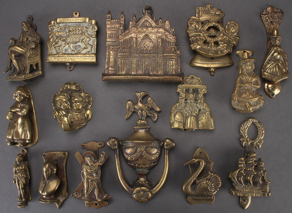 14 ENGLISH FIGURAL BRASS DOOR KNOCKERS, EARLY 20TH CENTURY. Including Shakespeare, Jenny Jones, Exeter Cathedral, HMS Victory, Widdesombe, Sherborne Abbey Monks and others. Largest height 6 inches (15 cm).