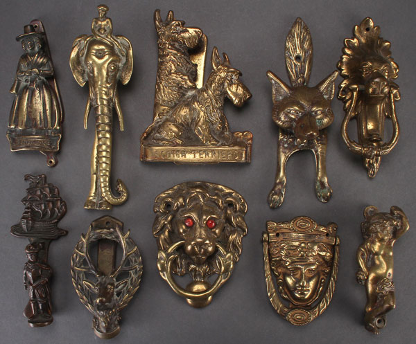 10 ENGLISH FIGURAL BRASS DOOR KNOCKERS. Including Jenny Jones, Scotch Terriers, lions heads, fox, elephant and others. Largest height 6.75 inches (17 cm).