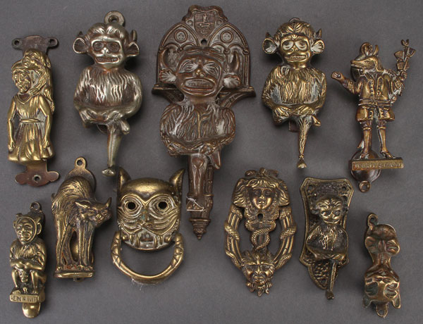 11 ENGLISH FIGURAL BRASS DOOR KNOCKERS. Including "Trusty Servant" (fox), cats and others. Largest height 6.25 inches (16 cm).