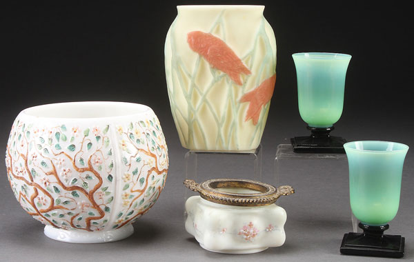 AN AMERICAN ART GLASS GROUP, 19TH AND 20TH CENTURY. Comprising an enameled milk glass "Tree of Life" bowl, a Phoenix glass vase, a Wavecrest dresser box and two green opalescent deco juice glasses. Largest 5.75 inches (14.5 cm).