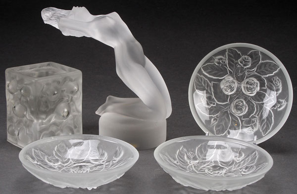 A LALIQUE AND VERLYS ETCHED GLASS GROUP, 20TH CENTURY. Comprising a nude Charysis mascot paperweight, three Verlys embossed rose 4 inch trays, and a Barolac etched crystal candle holder. Largest height 5.5 inches. Together with A LALIQUE ‘DANSEUSE’ GLASS FIGURE, LAST HALF 20TH CENTURY. Modeled as a nude, underside marked “Lalique France”. Height 9.25 inches.