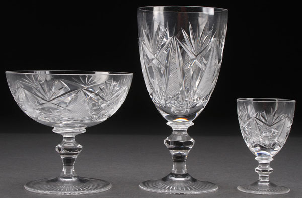 A 31 PIECE SET OF CUT CRYSTAL STEMWARE, 20TH CENTURY. Comprising 11 water goblets, 10 sherbets, and 10 wines, each with matching cut designs. Largest 6.25 inches (16 cm).