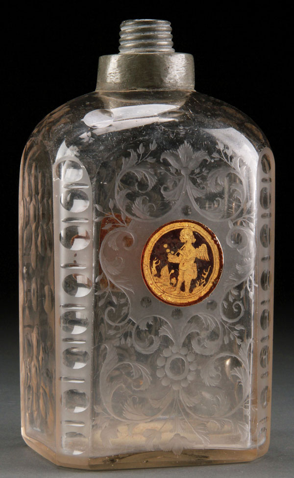 A BOHEMIAN "ZWISCHENGOLD" FLASK, 18TH CENTURY. Of rectangular form with chamfered corners, finely wheel engraved with scrolled florals and leaves surrounding inset gilt over maroon medallions depicting a cherub blowing bubbles and double flaming hearts with crown on verso. Height 8 inches (20 cm). (Unillustrated)