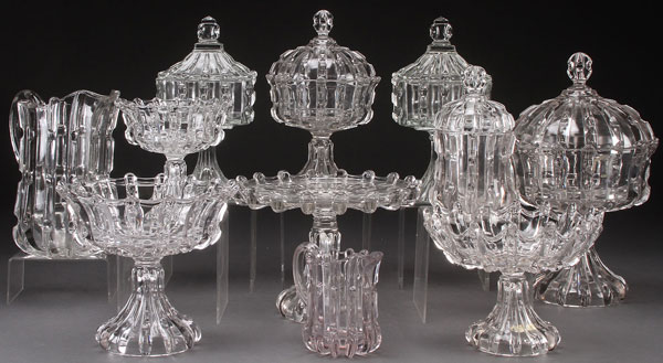 A 12 PIECE COLLECTION OF "BROKEN COLUMN" PATTERN GLASS, PROBABLY U.S. GLASS CO., LATE 19TH CENTURY. Comprising a pitcher, covered compotes, cake stand and other items. Largest 8 inches (20 cm).