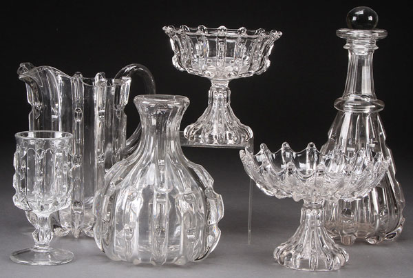 A SIX PIECE COLLECTION OF "BROKEN COLUMN" PATTERN GLASS, PROBABLY U.S. GLASS CO., LATE 19TH CENTURY. Comprising a water bottle, decanter, pitcher, compotes, and goblet. Largest 11.75 inches (30 cm).