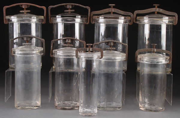 A COLLECTION OF NINE WHITALL TATUM GLASS CANNING JARS, LATE 19TH CENTURY. With patented iron fasteners and glass lids, last patent date June 11, 1895. Largest height 10.5 inches (26.5 cm). Mixed diameters of 6 inches, 4.5 inches, 4 inches. Some losses and damage.