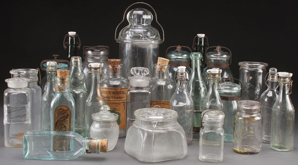 APOTHECARY, CANDY AND DRUG STORE JARS, EARLY 20TH CENTURY. A group of 30 various pressed glass jars including apothecary, canning, and early drug store jars. Some with original paper litho labels, most complete with stopper, lid, or cork. Height ranging 5 inches (12.7 cm) to 15 inches (38.1 cm).