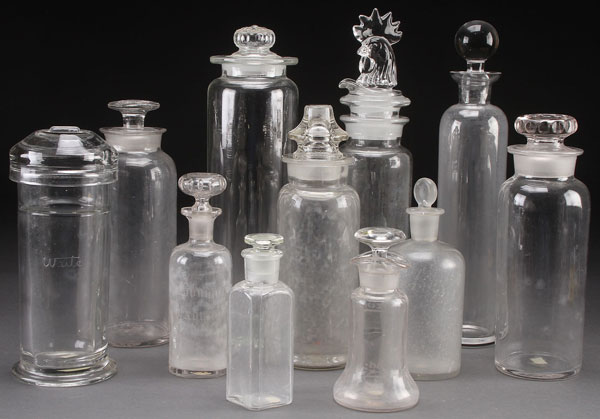 APOTHECARY DRUG STORE JARS, EARLY 20TH CENTURY. A group of 11 pressed glass apothecary jars including a Heisey cocktail shaker with rooster head stopper, along with various other jars with glass stoppers/lids. Height ranging 6.5 inches (16.5 cm) to 14.5 inches (36.8 cm).
