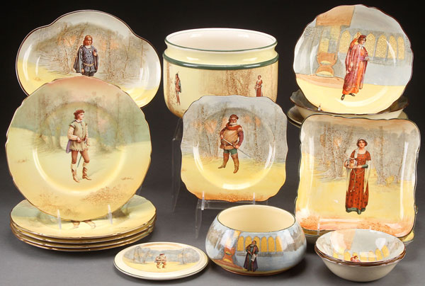 AN 18 PIECE GROUP OF ROYAL DOULTON SERIES WARE, EARLY 20TH CENTURY, SHAKESPEARE PLAYS. Including a jardinière, Hamlet tray, Shylock bowl, and various other plates and trays. Largest diameter 10.5 inches (26.5 cm).