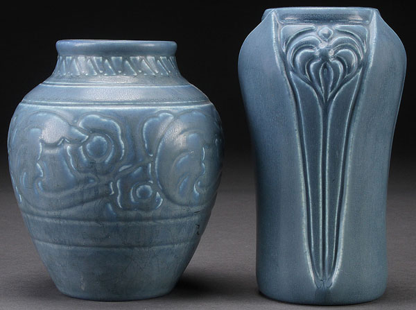 A PAIR OF ROOKWOOD CERULEAN BLUE MATTE GLAZED ART POTTERY VASES, 1926 AND 1924. With embossed decoration, incised Rookwood logo, dates, and shape numbers 2865 and 2141. Height 6 inches (15.2 cm) and 6.5 inches (16.5 cm).