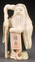 A JAPANESE CARVED AND POLYCHROME IVORY OKIMONO, PROBABLY MEIJI PERIOD. Depicting an immortal with staff and scroll. Height 4 inches (10 cm).