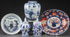 A FIVE PIECE GROUP OF ORIENTAL CERAMICS, 19TH AND 20TH CENTURY. Comprising an early Korean blue and white plate with figure, a Chinese blue and white vase, two Chinese lidded jars with dragons and figures, and an oval Imari plate. Largest length 10.75 inches (27.3 cm).