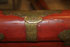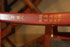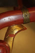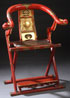 A FINE CHINESE HORSESHOE BACK RED LACQUER AND GILT CHAIR, PROBABLY 19TH CENTURY. The tapered backsplat containing gilt lacquerware panels with reticulated designs and an embossed double dragon motif, below a horseshoe curved back with incised bronze ornaments terminating with carved scroll ends, above a folding leather seat. Height 41.75 inches (106 cm), width 32.75 inches (83.5 cm), depth 20 inches (50 cm).