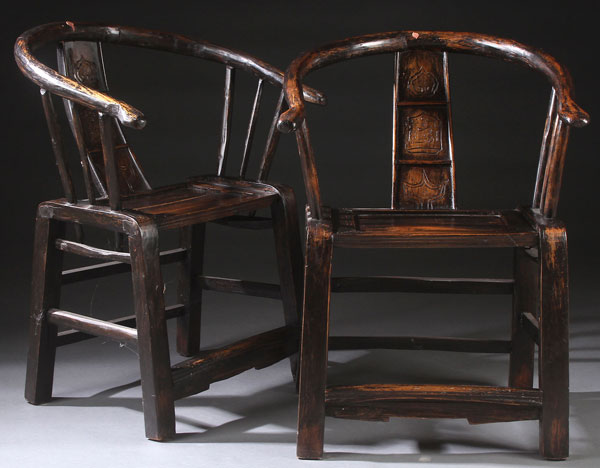 A PAIR OF CHINESE HORSESHOE BACK ARMCHAIRS, 20TH CENTURY. With carved backsplats. Height 35.75 inches (91 cm), width 26 inches (66 cm), depth 23.75 inches (60 cm).