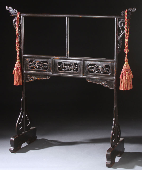 A CHINESE CARVED AND EBONIZED GARMENT STAND, EARLY 20TH CENTURY. With reticulated dragon carved panels, surmounted with figural dragon head finials, remnants of gilt. Height 59 inches (150 cm), width 55 inches (140 cm).
